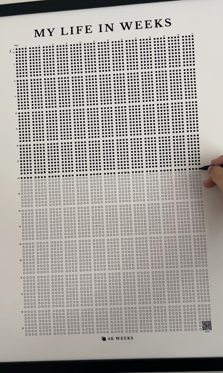 This week I checked the last box in the row on my 4K Weeks calendar. It is a simple grid with 52 rows representing the weeks of each year and 88 columns representing the years I may optimistically live. The top left begins on my birthday, October 5th, and the bottom right marks what would be my 88th.